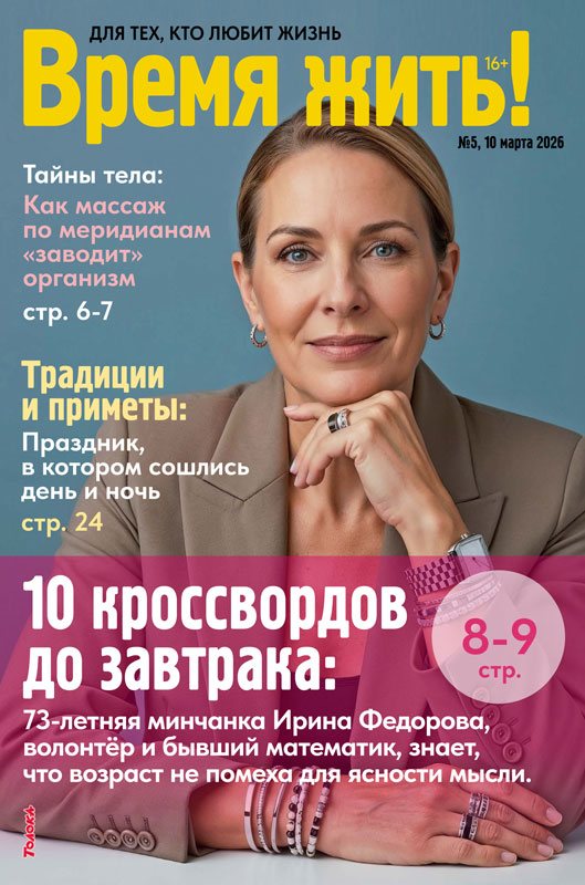 Повороты судьбы: Минчанке Ирине Федоровой 73 года, в прошлом учитель математики. Пару лет назад стала волонтером, ведет кружок «Гимнастика для ума». Не садится завтракать пока не разгадает 10 кроссвордов и считает, что даже перелом руки можно обратить во благо мозгу. От нее – практические советы, как сохранить ясность ума на долгие годы. Тайны тела: В китайской традиционной медицине боль в одном органе рассматривается не изолированно, а в комплексе со всем телом. Поэтому считается нормой, когда после массажа лица, например, проходят отеки в ногах или когда после «включения» мышцы на ноге нормализуется работа пищеварительной системы. Можно ли этому научиться? Почему в Китае считают самым правильным массаж по меридианной системе? Зачем его адаптировать к особенностям организма европейцев и каких результатов можно добиться? Об этом расскажет сертифицированный массажист из Москвы, которая прошла обучение в Китае. Традиции и приметы: Один из самых замечательных дней марта – день весеннего равноденствия. Праздник, в котором сошлись день и ночь, языческие и христианские традиции. В этот день предсказывали погоду, гадали, соблюдали определенные запреты и пекли особые пирожки в виде птичек. Мы расскажем все самое интересное про этот день, который запросто может стать праздничным в вашем семейном календаре и объединить разные поколения. Гигиена: Вы уверены, что для чистки зубов вам достаточно обычной зубной щетки или даже электрической? Оказывается, есть и особенные щетки, которые могут значительно облегчить уход за полостью рта людям с зубными протезами и другими стоматологическими конструкциями.