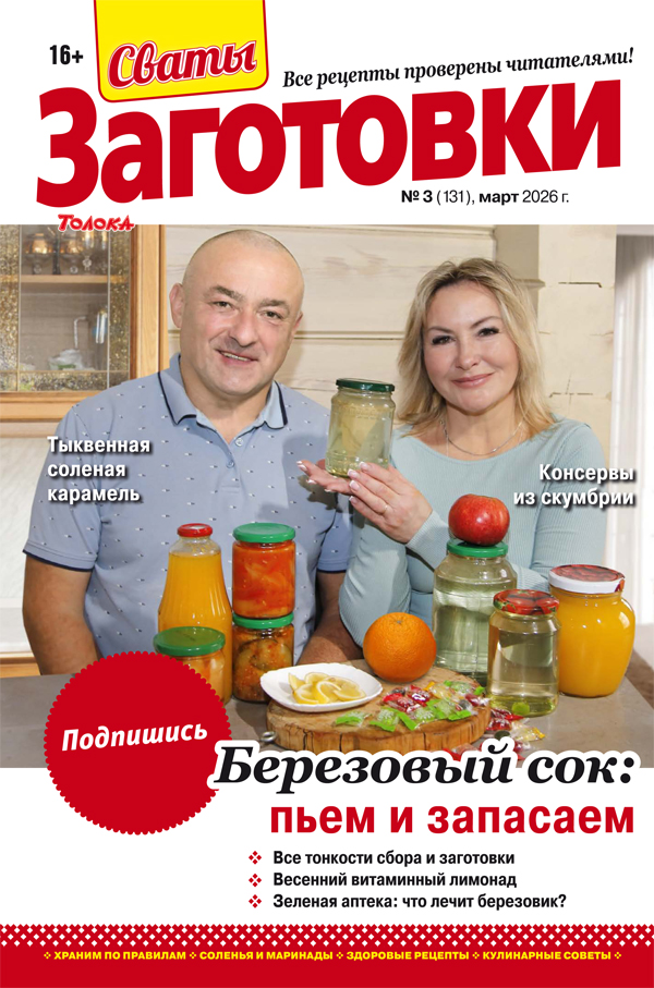 «Сваты. Заготовки» №3 Основной темой мартовского номера станут тонкости сбора и заготовки березового сока. Сколько березовика пить для пользы здоровью? Кому вовсе стоит отказаться? От каких недугов спасает? Какие альтернативные способы применения существуют? На эти вопросы ответят специалисты. А хозяюшки поделятся проверенными рецептами заготовок для долгого хранения главного весеннего напитка. Бульонный концентрат на запеченных говяжьих косточках – настоящее спасение для занятой хозяйки. А домашние шпроты из кильки получаются вкуснее, полезнее и дешевле магазинных. В выпуске вас ждут и другие рецепты отличных мясных и рыбных деликатесов: сытного и бюджетного сальтисона, печеночной колбасы, рулета из сала, маринованной скумбрии и не только. Хмельная настойка на… гречке – напиток, который точно порадует гостей ароматом свежеиспеченного ржаного хлеба с румяной корочкой. Наши авторы умеют удивлять!