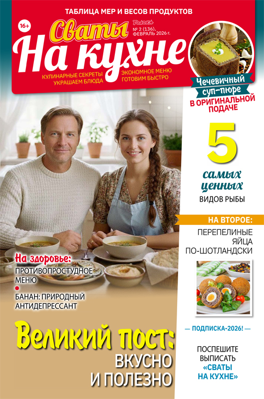 • Тема номера: «Великий пост: вкусно и полезно». Нежные голубцы с рисом и орехами, сочная барбунья по-турецки, ароматный тыквенный суп из викторианской эпохи — без единого продукта животного происхождения, но с превосходным вкусом и настоящей сытостью. Диетолог объясняет, почему от фасоли бывает метеоризм, и как есть бобовые без дискомфорта. А священник честно отвечает на главные вопросы: зачем вообще нужен пост и стоит ли его соблюдать детям. Бонус: подробный календарь питания на Великий пост. • По сезону. К празднику 8 Марта. Хотите порадовать близких? Приготовьте аппетитный сэндвич с сочной курочкой на завтрак (диетолог одобряет!), а на романтический ужин — салат-комплимент от шеф-повара с тунцом и бенто-тортик «Для любимых», нежный, лаконичный, как настоящее признание. Если же хочется чего-то особенно изысканного — попробуйте итальянское печенье «Поцелуй дамы»: хрустящее, тающее, с намеком на старинную галантность. • Сладкий стол. Представьте: влажные шоколадные коржи, пропитанные абрикосовым сиропом и коньяком, шелковистый крем с благородным какао и хрустящая карамельно-ореховая крошка сверху. Это торт «Прага», который заставляет замедлиться и наслаждаться моментом. Стоит потратить время и непременно приготовить его! • Несладкая выпечка. Хрустящее печенье с сыром и кунжутом, пышный осетинский пирог сабурина, ароматный содовый хлеб на пиве — вся эта выпечка не требует духовки на максимум и часов у плиты. А технолог расскажет, как выбрать в магазине действительно качественный хлеб, а не просто красивую упаковку. «Сваты на кухне»: открываем новые кулинарные горизонты! Шеф-редактор